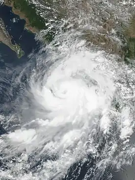 ![]() Vista de imagen del satélite, el huracán Nora en su máxima intensidad el 28 de agosto de 2021 | ||