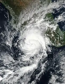 ![]() Vista de imagen del satélite, el huracán Rick a punto de tocar tierra cerca de Lázaro Cárdenas en Michoacán el 24 de octubre de 2021 | ||