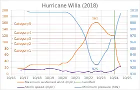 Velocidad máxima del viento sostenida y presión mínima del huracán Willa