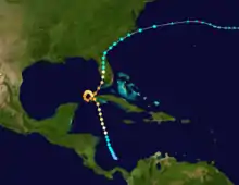 Conducida por corrientes desde un área de presión alta al norte, la tormenta inició un recorrido hacia el noroeste y rápidamente se dirigió sobre las aguas calientes del golfo. Ejecutó un bucle en sentido antihorario, y continuó creciendo.[3] El 16 de octubre alcanzó vientos de 240 km/h con una presión barométrica mínima de 924 mbar.[1] El huracán giró hacia el nordeste, acercándose de nuevo al oeste de Cuba, y se empezó a acelerar hacia la península de Florida el 17 de octubre.[1] Su centro se aproximó hacia el oeste de Cayo Hueso (Key West) y tocó tierra en cabo Romano.[3] La tormenta se movió hacia el norte mientras se disipaba en forma de tormenta tropical. Desde el nordeste de Florida, el ciclón giró hacia el nordeste y tocó la costa del sudeste de los Estados Unidos antes de dirigirse a mar abierto.[3] Se cree que la tormenta se disipó el 23 de octubre.[1]