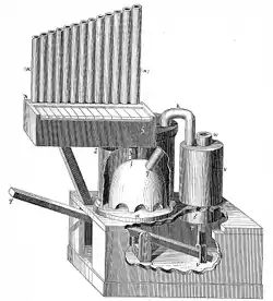 El agua y el aire entran en el instrumento y llegan juntos a la cámara eólica. A continuación, el aire comprimido entra en un compartimento situado en la parte superior de la cámara eólica, y desde aquí, se distribuye hacia los tubos del órgano.