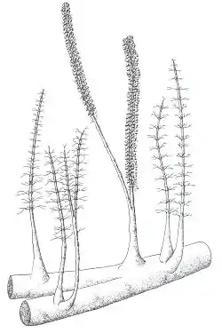 Emergiendo de esos ejes, verticalmente si se asume que eran efectivamente rizomas, aparecen unas ramificaciones de base engrosada y con marcadas nervaduras o acanaladuras longitudinales. La surgencia de los ejes verticales tenía lugar en zonas concretas del rizoma tanto de su cara dorsal como deen la lateral de modo que de un mismo punto, que podría corresponderse a un nudo, parecían crecer entre tres y cinco ejes y tras una leve curvatura se alineaban todas entre sí. Las ramificaciones poseían un cilindro vascular con haces de xilema de sección en V y aunque en los primeros fósiles no se observó estos ejes verticales dicotomizaban varias veces.[2]