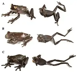 Su dorso es marrón oscuro con motas y manchas anaranjadas. El vientre es marrón grisáceo. Mide entre 6 y 7 cm.[2] Tiene una especie de garra en el pulgar, cuya función se desconoce pero que se cree que podría ser usada en luchas entre machos y como protección ante sus depredadores.[3] Está gravemente amenazada de extinción principalmente por la pérdida de hábitat causada por la minería ilegal.[2]
