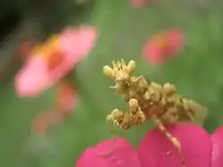 Harpagomantis tricolor, mímica de flores. Subfamilia Hymenopodinae.