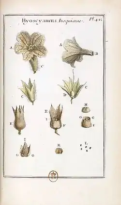 ![]() Ilustración original del género en Joseph Pitton de Tournefort, creador del taxón, 1694 - Leyenda: A: Flor; B: Apertura basal de la corola; C: Cáliz; D: Pistilo ;E. Cáliz en la fructificación, F: Fruto, H-K: Tapa del fruto; I: Tabique del fruto; G: Lóculos del fruto; L: Simientes | ||