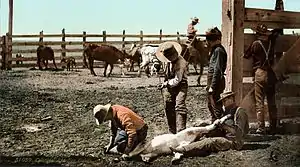 El cowboy o vaquero tradicional para marcar el animal lo capturaba y sujetaba con una soga , tendiéndolo sobre el suelo, atando sus piernas juntas, y aplicando una marca de hierro calentada en un fuego. La práctica de los ranchos modernos ha evolucionado hacia el uso de rampas donde los animales son confinados en un área limitada y sujetados de forma segura mientras se les aplica la marca. Dos tipos de restricciones usados son el brete o cepo para animales o el potro de herrar (para ganado más grande), que puede cerrarse sobre cualquiera de los lados de un animal de pie, o una cuna para marcaje, donde los terneros son capturados en una base que gira de manera que el animal está acostado sobre su lado.