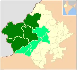 ![]() Zona de origen del marwari en Rayastán. Áreas dialectales adicionales de hablantes que identifican al marwari como su lengua nativa.
