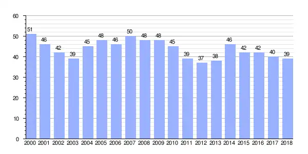 | Gráfica de evolución demográfica de Iglesia entre 2000 y 2018 |