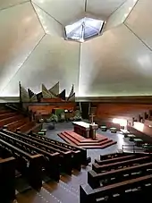 El edificio tiene forma hexagonal, con una aguja central de metal de 59 m de altura.[1] Debajo de la aguja, hay un óculo que admite luz en el nivel principal. El santuario está ubicado en el centro del edificio, con la Mesa del Señor ubicada en el centro del santuario. Filas de bancos rodean el altar en un hexágono, lo que refleja la idea de que la adoración debe ser un aspecto central de la vida de la congregación. El nivel inferior contiene aulas, un auditorio, una cocina y un área de actividades.[2]
