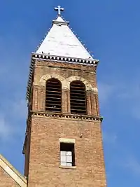 Tiene una torre de planta cuadrangular con una puerta y una ventana al oriente y otra ventana al norte, practicadas en el revestimiento de almohadillado que se eleva hasta las impostas de las ventanas;[2] sigue el cuerpo de la torre de mampostería y tabique con una ventanilla cuadrangular en los mismos costados, para continuar con dos ventanillas ajimezadas en cada uno de los cuatro lados, y remata el conjunto en forma de pirámide cuadrangular con sus parámetros de pizarra.[2]