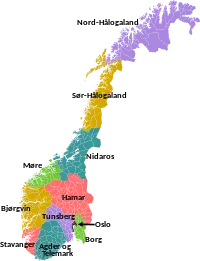 - La Diócesis de Borg, con sede en Fredrikstad. La diócesis abarca las provincias de Østfold y Akershus, con la excepción de Asker y Bærum.