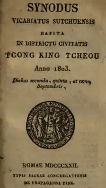 El 2 de septiembre de 1803, el obispo Gabriel-Taurin Dufresse convocó cerca de Chungkingchow (Tchong-king-tcheou), 40 kilómetros al oeste de Chengtu, el primer sínodo católico en China.[18][33] Participaron trece sacerdotes chinos y dos sacerdotes franceses, a saber, Dufresse y Jean-Louis Florens.[34] Las decisiones publicadas en Synodus Vicariatus Sutchuensis se refieren principalmente al cuidado pastoral de los sacramentos. El capítulo X trata del ministerio de los sacerdotes, recomendando fervor en la vida espiritual y discreción en las cosas temporales. Las disposiciones del sínodo de Sichuan iban a guiar el apostolado en esta provincia y en muchas otras regiones de China hasta el concilio de Shanghái en 1924.[35][36]
