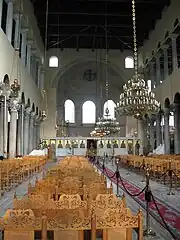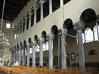 El edificio es una basílica de tres naves, de unos 28 m de ancho y 36,5 m de largo, con techo de madera. Su extremo oriental es una bóveda semicircular, mientras que en el lado occidental sobrevive un narthex, flanqueado por torres, y restos de un exonarthex. Los tres pasillos están separados por columnas, mientras que los dos pasillos laterales tienen galerías sobre ellos. En el extremo oriental del pasillo lateral norte, se adjunta una capilla bizantina dedicada a Santa Irene. En la esquina noroeste de la basílica, sobrevive la escalera que conduce a las galerías. La entrada actual es a través de una abertura de triple arco ( tribelon ) que conecta el nártex con la nave principal, mientras que en el lado sur hay una entrada monumental, que probablemente conectaba la iglesia con la vía de la era bizantina de la ciudad. Otro pequeño edificio contiguo en el lado sur ha sido identificado como el baptisterio de la iglesia.[1][2] El techo moderno es más bajo que el original, donde la sección sobre la nave central se elevó para permitir la entrada de luz.[4]