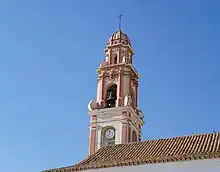 La torre de campanario está situada a la izquierda de la puerta central de la iglesia, consta de tres cuerpos de los cuales el último es el campanario de estilo barroco y construido tras el terremoto de Lisboa (1755) y levantada con donativos de la familia ayamontina de los Galdames.