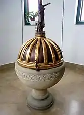 Está estructurado en tres cuerpos de cinco calles con sus propios basamentos y frisos respectivamente recogiendo una iconografía representada por escenas de algunos milagros de Jesús como la curación del paralítico, la resurrección de Lázaro o la curación de un endemoniado.[4]