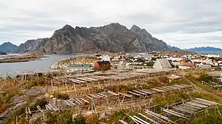 La Capilla Henningsvær fue construida originalmente en Henningsvær en 1852. Una nueva iglesia fue construida en 1974 para reemplazar a la capilla antigua.[3]