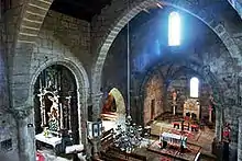 La iglesia se halla decorada en su interior con inscripciones de origen medieval, escudos y varias tumbas que aún no han sido investigadas como se merecen.