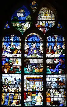 • Los vitrales del siglo XV son aún más famosos. Adornan cuatro vanos en los dos últimos tramos gótico-renacentistas de la fachada occidental . Otras dos vidrieras renacentistas también decoran las ventanas inferiores de la fachada oeste. Provendrían quizá de Ruan, de los talleres de Arnoult Nijmegen (Arnold van Nijmegen), artista del vidrio holandés que también diseñó las vidrieras de la iglesia Sainte-Jeanne-d'Arc de Rouen.[3] En su mayoría representan escenas del Antiguo Testamento o de la vida de Cristo: Jesús y la samaritana junto al pozo de Jacob, Moisés y la travesía del mar Rojo por los hebreos, la última cena, los Reyes Magos, la vida de San Juan Bautista y un árbol de Jesse. Se constata que el maestro vidriero en la representación del paso del mar Rojo supuso el mar y sus olas de color... ¡rojo!