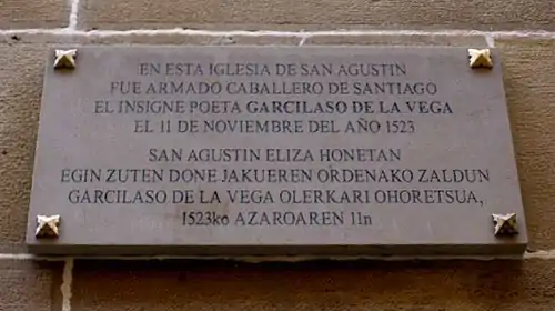 Entre los sucesos ocurridos en dicho convento, voy a mencionar sólo el siguiente, por la calidad del personaje. Por cédula del emperador Carlos I, librada el 6 de septiembre de 1523, con el refrendo del secretario Francisco de los Cobos, se hizo merced del hábito de Santiago a Garcilaso de la Vega, encargando a Pedro de Toledo, marqués de Villafranca y comendador de Monreal, que le armara caballero. Se celebró la ceremonia en el convento de San Agustín de Pamplona, el jueves 11 de noviembre del mismo año de 1523. Bendijo el hábito e insignias Jorge Morales, Capellán de S. M. y Caballero de la misma Orden, quien, junto con Pedro de Toledo, firmó el acta conservada, junto con la cédula firmada del emperador, en los archivos del Duque del Infantado. Figura también como testigo de la ceremonia, el conde de Palma, Luis Portocarrero, Caballero de Santiago y pariente de Garcilaso.[8][10][11] En recuerdo a este acontecimiento existe una placa conmemorativa en la fachada de la iglesia que, además de la traducción al euskera, dice en español: