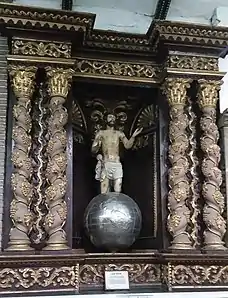 La base de los pilares y la hornacina son bastante simples con un patrón repetido que tiene en su centro un motivo de flor rodeado por tallos y hojas de plantas los cuales estaban todos bañados en hojas de pan de oro con un fondo de color aguamarina (muy parecido a la pigmentación utilizada en el retablo del altar mayor de la iglesia). A ambos lados del gran nicho se levantan dos columnas de orden salomónico de fuste enroscado y a lo largo de este se entrelaza a forma de enredadera, una liana de la cual brotan frutos como vides y racimos de uvas, atrás de estas hay placas con formas vegetativas aunque no todas coinciden en diseño y en la cima de los pilares se encuentran capiteles similares al orden corintio pero no logrados ser reproducidos fielmente por los artistas barrocos. Finalmente un arquitrabe o friso destaca en la parte superior del monumento cuyo color no encaja del todo (sobre todo en la parte de la mitad).