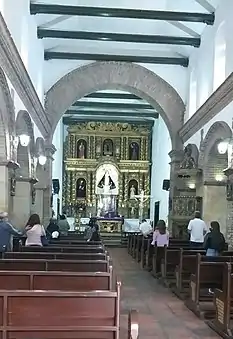 El gran arco toral separa a la nave central del presbiterio, el lugar más sagrado porque ahí se celebra la santa misa en el altar mayor enfrente del impresionante retablo barroco, a la izquierda de esta se ubicó la sacristía que tiene tanto acceso tanto al despacho parroquial, al camarín posterior y a los pisos superiores de la torre sur por medio de una escalera de caracol. Aparte de esto la iglesia cuenta también con una capilla adosada a la nave de la epístola, un baptisterio que está en la base del campanario y un coro sostenido por un sotacoro apoyado en vigas de madera al cual se puede acceder por medio de la estancia a la derecha, al lado contrario de la torre norte.