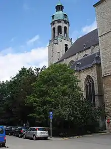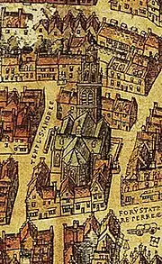 La construcción de la iglesia se inició en el siglo XVI por parte de los frailes agustinos, que habían construido un convento con una capilla en el mismo lugar en 1513. Johannes van Mechelen de Osbach inició en 1508 la fundación del monasterio. Los agustinos decidieron construir allí una iglesia en 1514, pero al ser acusados de simpatías luteranas se les retiró el terreno. En 1527 el terreno fue parcelado para financiar la construcción de la iglesia.[1] La antigua capilla del convento fue ampliada y luego consagrada como iglesia parroquial en 1529.[2] La iglesia se amplió posteriormente con una torre en el oeste y un crucero.[1]