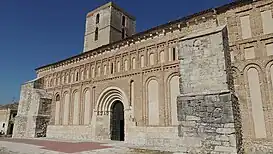 En la fachada sur se encuentra una portada de piedra con cinco arquivoltas con molduras de toro. Tiene una cornisa de piedra con canecillos, y toda la parte superior está decorada con arcos ciegos y frisos de esquinillas.