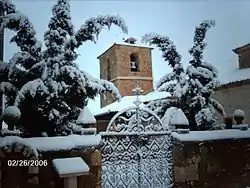 La entrada a la Iglesia se hace desde la esquina de la Calle Real con la Calle Cantarranas. Un muro de piedra de metro y medio de altura separa el jardín de la Iglesia de la carretera. Se accede al jardín a través e una puerta metálica, sobre la cual es tradición colocar un arco realizado con ramas y flores para los días de las fiestas del pueblo. Este arco suele tener unos 5 metros de altura.