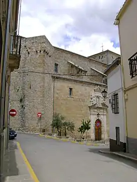 La fachada oeste, correspondiente a los pies del templo, proyecta en alzado un rico juego de volúmenes presidido por el adose de las dos torres medievales, dominando en altura la esquinada torre-campanario entre las fachadas norte y oeste. A media altura sobresalen unas ménsulas que servían de apoyo a algún tipo de balconada y en la parte superior se abren sencillos vanos rectangulares; su planta baja es maciza, estando la primera cubierta por una bóveda de horno de mampostería, la segunda por otra de arista con nervios cruzados, y correspondiendo la última al campanario, con reciente cubierta de madera a cuatro aguas. La segunda de las torres, de características similares, se conserva solamente hasta media altura y en la que se perciben las mismas ménsulas de apoyo. Esta fachada se interrumpe por un único vano, que consiste en una ventana ligeramente apuntada y geminada adornada con un artístico rosetón.