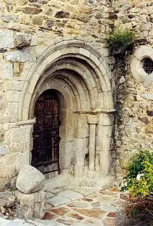 En la fachada meridional hay un portal con arco de medio punto encuadrado por columnas con capiteles esculpidos y cuatro arquivoltas. La decoración de los capiteles es muy sencilla, con rostros esculpidos enmarcados por rayas verticales incisas.[1] La primera y la tercera arquivolta presentan dovelas biseladas, y la segunda está ornamentada con una moldura cilíndrica.