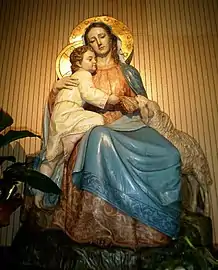 La fachada está adornada por tres figuras construidas en cemento: San Antonio de Padua, encima del acceso principal, cuya iconografía le representa con el Niño Jesús en brazos, obra del escultor Áureo Rebolé; en la puerta secundaria, más al sur, Santa Teresita de Lisieux, con los Evangelios abiertos y un ramo de flores; y, por último, en el chaflán, la imagen de San Francisco de Asís sobre la puerta de acceso al convento obra de Ramón Arcaya que ya había realizado pocos años antes otro monumento a San Francisco de Asís en Pamplona. Se da la circunstancia de que es la última escultura que realizó este artista.
