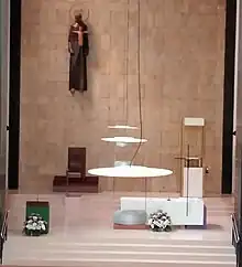 El presbiterio fue restaurado por dos ilustres gijoneses, el escultor y pintor Joaquín Rubio Camín y el arquitecto José Marcelino Díez Canteli de acuerdo con las disposiciones impulsadas por el Concilio Vaticano II. La imagen de san Antonio de Padua destaca a la izquierda del presbiterio, que aparece acompañado por un Cristo crucificado de acero, obra de Rubio Camín. El presbiterio se completa con el altar, el ambón, los sitiales, y el sagrario.[3]