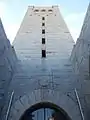 La base de la torre arranca de un pórtico formado por cuatro grandes arcos de medio punto, que configuran el acceso monumental al recinto. La entrada a la torre se sitúa entre los dos arcos centrales del pórtico, más separados que los laterales para configurar un espacio de acogida. Frente a dicha entrada se dispone un espacio ajardinado cuyo diseño geométrico continúa las líneas compositivas del pórtico. La torre-osario y el pórtico se revisten exteriormente con grandes bloques de granito que dotan al conjunto de una apariencia solemne y acorde con su carácter castrense.
