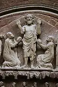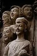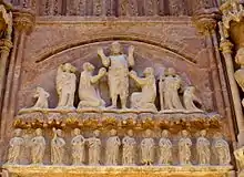 El tímpano de la portada, que muestra a Cristo Redentor entre la Virgen y San Juan, queda desplazado hacia abajo ya que en el siglo XVI el cantero Pedro de Acha reforma el coro y hace una pequeña ventana para que entre luz. De esta reforma es fruto también el arco renacentista que sustenta este coro.