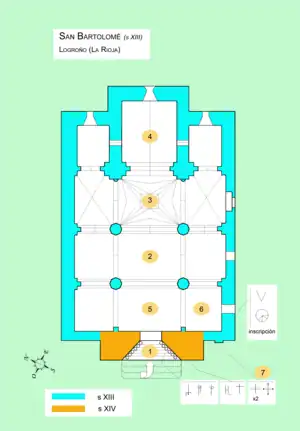 }} La iglesia de San Bartolomé es la iglesia más antigua de la ciudad de Logroño. Su construcción se remonta al siglo XII, por lo que conserva en parte estilo románico, en la cabecera y en la parte inicial de la torre, y transcurre durante el siglo XIII, con el estilo gótico en desarrollo, construyéndose la magnífica portada ojival, que contiene algunas esculturas románicas que narran la vida del santo y otros pasajes de la Biblia. La Iglesia de San Bartolomé está en el Hito N.º 9 en el Camino de Santiago Francés. Se encuentra a 612 km de Santiago de Compostela. Fue declarado Monumento Nacional en 1866.
