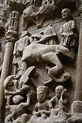 Las escenas de la portada constan de 19 viñetas, representando en el lado izquierdo el martirio de San Bartolomé y en el derecho el hallazgo de sus restos. De forma más detallada, si empezamos por el extremo derecho, vemos en la primera escena a San Bartolomé salvando a la hija lunática del rey Polemón, son tres cuadros, un hombre (1), una mujer(2) y el santo(3), el cuarto está vació pero podría haber estado Polemón ; en la segunda vemos al santo en un cuadro(5) y a un grupo de doncellas en otro(6), está evangelizando en la Corte; en la tercera, está expulsando al demonio de entre los ídolos paganos, y haciendo que el resto se convierta, enfadando así a algunos sacerdotes, consta de los siguientes cuadros, los sacerdotes (7), el ídolo Berith sobre una columna y debajo orando (8) y el santo con un cofre en la mano expulsando al demonio(9); en los siguientes dos cuadros (10,11) vemos como el santo es conducido por un soldado ante el rey Astiages. En el extremo izquierdo podría haber habido alguna escena más, puede que fueran destruidas al construir el Palacio de Monesterio. El cuadro doce está vacío. Los cuadros 13-16 Bartolomé derrota al ídolo Baldach, a quien Astiages adora y haciendo que le mande azotar por su enfado, pero le manda desollar vivo por parecerle insuficiente castigo. Podemos verle sujeto de los cuatro miembros siendo despellejado sobre una mesa que sujetan tres figuras femeninas: la lujuria, la vanidad y la pereza. Los cuadros 18 y 19 nos muestran a San Bartolomé predicando con su propia piel al hombro.