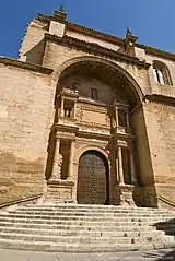 Al exterior, y en los flancos norte y sur, abren sendas portadas laterales, la primera inclusa con un frontón partido en el remate y la segunda, más espectacular, es una de las más bellas de estilo vandelviresco en la provincia de Albacete, por su composición trazado y ejecución. Sigue el tipo de la fachada principal del Salvador de Úbeda y la portada meridional de la Catedral de Jaén, cobijándose también bajo gran arco. En el segundo cuerpo ofrece una gran cartela lisa, en lugar del gran relieve que es frecuente en las obras religiosas de Vandelvira; como en otras obras de maestro presenta con profusión espejos y medios espejos circulares convexos, uno de los motivos geométricos propios del manierismo de origen vandeviresco, que tiene en nuestra provincia una considerable representación en los finales del siglo XVI. En el remate y una hornacina hay una imagen de la Virgen del "Popolo". Camón Aznar fecha esta portada hacia 1575.