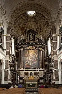 - En el ábside central, el altar mayor está coronado por una pintura, alternativamente una Elevación de la Cruz, de Gerard Seghers, y de una Coronación de la Virgen, de Cornelis Schut. Anteriormente, la gloria de este altar eran las dos pinturas Los milagros de San Ignacio de Loyola y Los milagros de San Francisco Javier,ambas de Rubens, que ahora sostienen la reputación del Museo de Bellas Artes de Viena. Mediante un ingenioso mecanismo de poleas (que se encuentra en varias iglesias jesuitas), las pinturas se pueden mostrar alternativamente.
