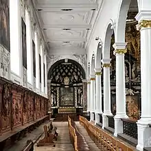 - Las paredes de los naves laterales están revestidas con paneles hasta una altura de 4 metros. Toda una serie de medallones tallados en la madera cuentan en 40 escenas, de un lado la vida de San Ignacio de Loyola y del otro escenas de la vida de San Francisco Javier.