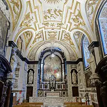 - En todo su ancho, el coro está separado de la nave central por un notable banco de comunión de madera (siglo XVIII), trabajado con motivos que recuerdan al pan eucarístico de la comunión. A ambos lados del ábside central están los absidiolos con altares laterales dedicados, uno al apóstol de las Indias, San Francisco Javier (a la izquierda) y el otro a la Virgen María (a la derecha).