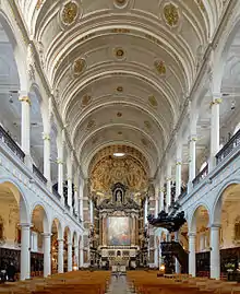 - La nave es amplia y da una impresión de calma y prosperidad. Está bordeada por naves laterales (estilo basilical) cuyas galerías superiores están sostenidas por elegantes columnas (que antes del incendio de 1718 eran de mármol). Las grandes ventanas que dan a estas galerías superiores permiten que la luz entre abundantemente en la iglesia.