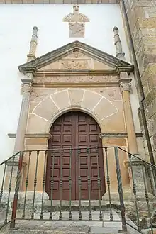 La decoración externa se localiza en el lateral sur, en torno a la portada principal, en arco de medio punto de grandes dovelas, enmarcada por dos columnas de fuste estriado, sobre un tallo basamento con decoración vegetal, y capiteles corintios que sustentan un entablamento entre dos cornisas decorado con angelotes, rematado por un frontón triangular en cuyo tímpano se representa la Natividad; en sus extremos hay dos pináculos. En las enjutas entre el arco y las columnas aparecen representaciones en bajorrelieve del sol, la luna y las estrellas.