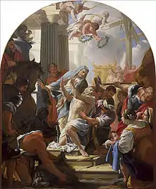 - Una copia[22] (parcial) de Alexandre-François Caminade de una tabla del Dominiquin, Le Martyre de sainte Agnès, cuelga sobre la puerta en la parte inferior de la nave lateral sur. El original, pintado alrededor de 1620 para el convento de Santa Inés de Bolonia, fue capturado durante la campaña de Italia y luego expuesto en el Museo del Louvre. Fue allí donde Caminade hizo una copia, comprada en 1808 por el cura de San Eustaquio. La tabla del Domenichino, restituida a la caída del Imperio, está ahora expuesto en la Pinacoteca de Bolonia.
