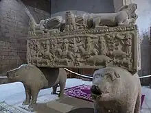El sarcófago está levantado del suelo sobre los animales representativos de los Andrade: un oso y un jabalí, a modo de peanas. En la cabecera y a los pies, el escudo de armas de los Andrade, y, en los laterales, diversas escenas de caza del jabalí.