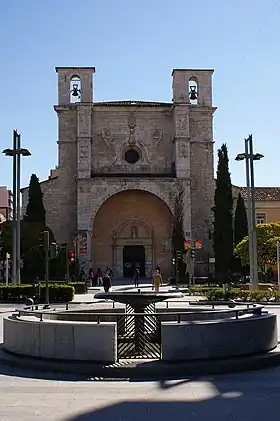 En la enorme fachada de piedra se enmarca la portada entre dos grandes contrafuertes coronados por espadañas . Sobre el rosetón central figura el escudo de la orden de Santo Domingo.