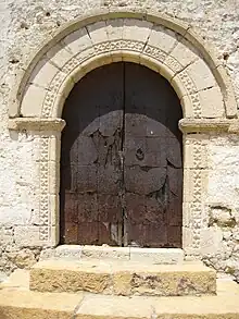 La puerta es un arco de medio punto, circunscritas las dovelas por una moldura o alfiz circular, decorada ésta y la imposta por un "nido de abeja". Las dovelas están decoradas con una cinta esculpida de tréboles de cuatro hojas que sigue por las jambas, excepto en una dovela donde se sustituye por un penitente o en otra donde hay dos rosas rodeadas más pequeñas separadas por dos esferas.