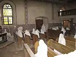 El interior del templo, en estado ruinoso y carente de ornamentos debido al expolio sufrido, alberga actualmente más de treinta[13] esculturas a tamaño natural cubiertas con telas blancas[1] y repartidas por las bancadas del santuario y zonas adyacentes, cerca de la tribuna, con algunas de pie y otras (la mayor parte) sentadas en los bancos. Según Hadrava: