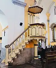 La escalera de acceso da hacia la nave del Evangelio, su baranda está adornada con siete arcos ojivales, el pedestal tiene una base en piedra sobre la que se sustenta una columna que la une con la cazuela o también conocido como flamero.