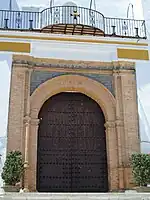 La portada principal, a la que se accede a través de una escalinata, es de estilo mudéjar-renacentista y está realizada mediante arco de medio punto de ladrillo, con azulejería en las enjutas, enmarcado por pilastras con finas columnas abalaustradas de orden jónico adosadas, también de ladrillo. Se corona con un balcón de fino balaustre de hierro forjado situado entre grandes contrafuertes rematados por pináculos, que le confiere un cierto aire civil y sobre el que se sitúa un gran óculo moldurado de ladrillo.