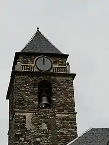 El campanario románico y modificado en el siglo XVII, de 31,97 metros de altura, es una torre de planta cuadrada formada por cuatro cuerpos situada a los pies de la iglesia encima del coro. La celda tiene cuatro ventanas de arco de medio punto, una en cada pared, de donde cuelgan las campanas; está rematada por un patio cubierto, con una balaustrada y un reloj de esfera.[1][3]